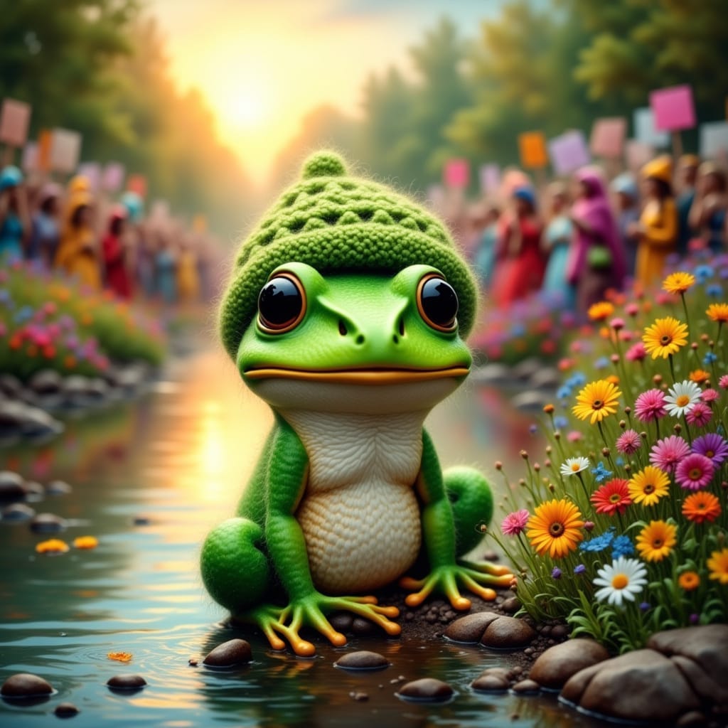 But I think maybe there’s something deeper happening here, something that connects to why my partner is at home crocheting frog hats for the upcoming No Kings rally, and why that image fills me with hope rather than despair.